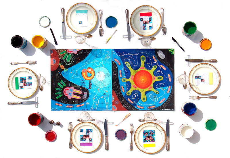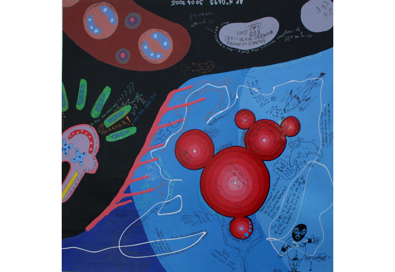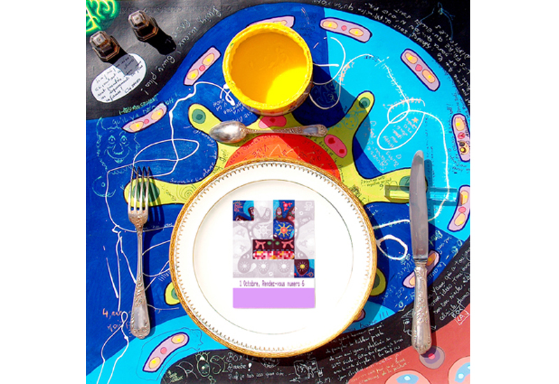 Culinary and participative action aimed at updating a contacts network on the scale of a city (Montpellier), through the organisation of a series of 16 dinners. The dinners gave rise to the ‘graffiting’ of 16 different segments of one painting. The participants were gathered to see the result as the 16 segments were joined together and displayed on the first day of the exhibition.